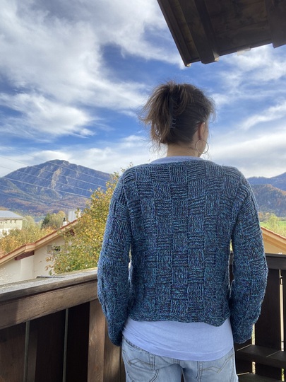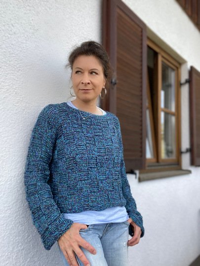 Der Pullover hat leicht überschnittene Schultern und lange weite Ärmel. Der Schnitt ist leger und kastig, der Körper kurz (kann problemlos verlängert werden). Das Schachbrettmuster erzeugt eine reliefartige Textur, wodurch der Pullover - je nach verwendetem Garn - relativ gut wärmt. Er sollte daher nicht zu eng sitzen. Dieses Modell ist sehr gut für den angesagten Layering-Look geeignet.