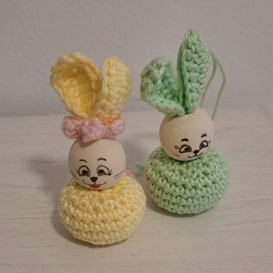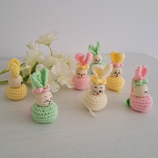 Die hier abgebildeten und beschriebenen Häschen sind ca 6 cm hoch und können wahlweise mit oder ohne Blümchen, zum Aufhängen oder Hinstellen, gehäkelt werden.