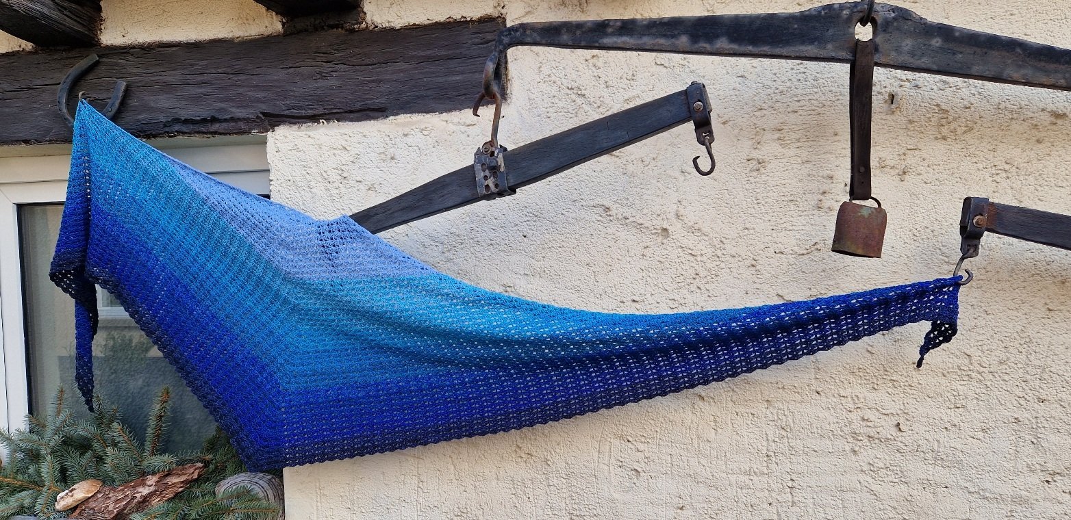 Bei Farbverlaufsgarn empfehle ich je nach Wunschgröße und Häkelstil eine Lauflänge ab 1000 m 3-fädig und eine dazu passende Nadelstärke.
