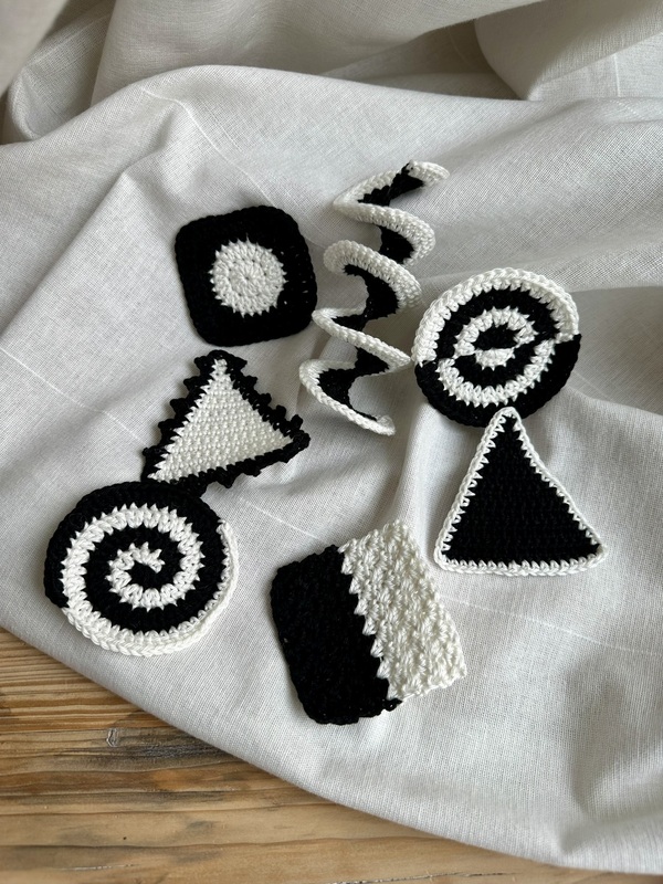 Häkelanleitung für Kontrast Anhänger für zb. eine Mobile, inspiriert von Munari und der Montessori-Pädagogik! Im Einklang mit der Montessori-Philosophie gestaltet, präsentieren die Anhänger klare, geometrische Formen. Die visuelle Stimulation steht im Mittelpunkt dieser kreativen DIY-Erfahrung, besonders für Babys von 0 bis 6 Monaten.