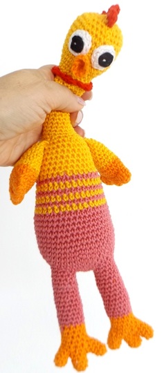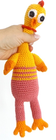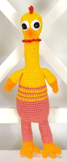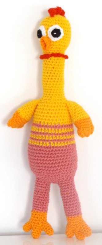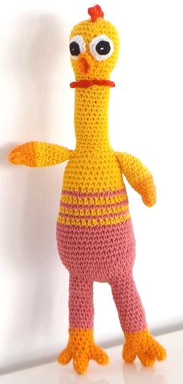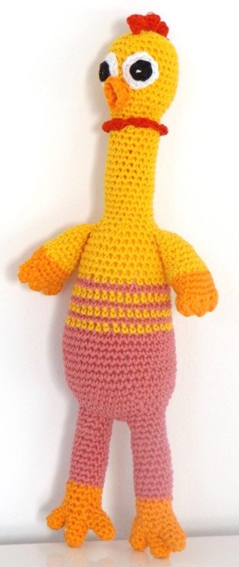 Die lustige Henne ist aus reiner Baumwolle gehäkelt und sicher auch in anderen Farben lustig.