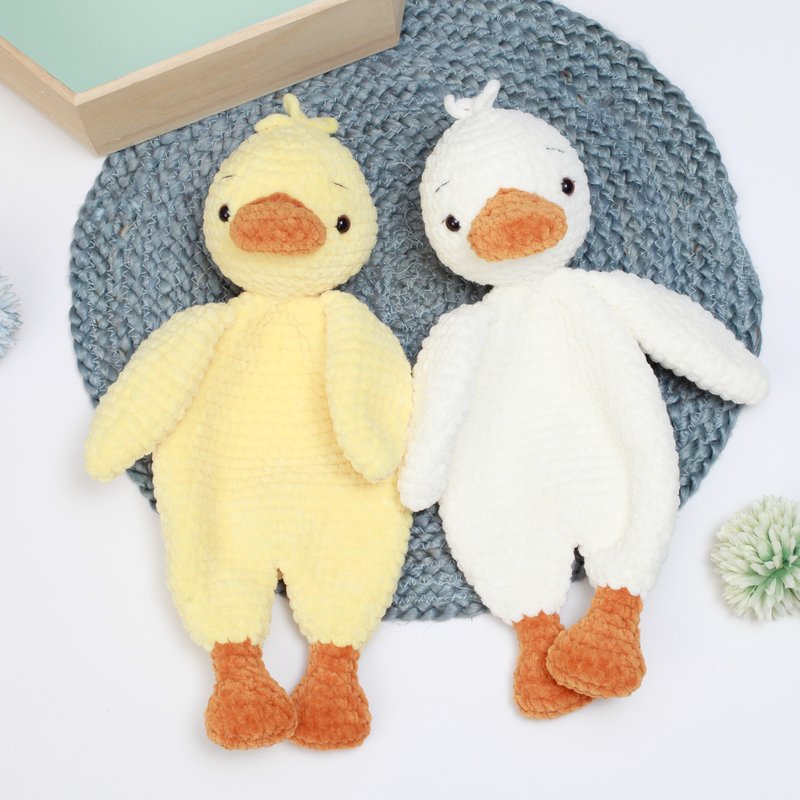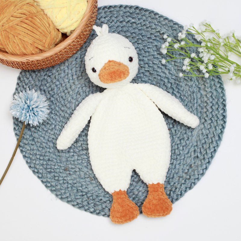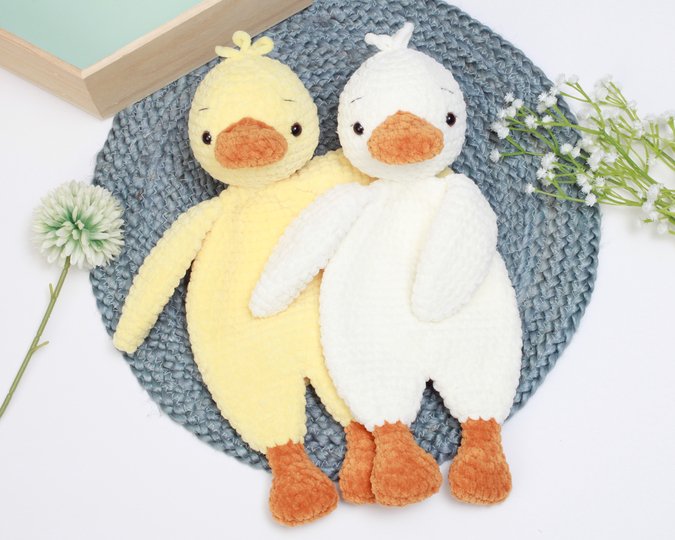Wenn Du dasselbe Garn und dieselbe Häkelnadel verwendest wie beschrieben, wird die Schmuseente ca. 32 cm (12,5 Zoll) groß. Du kannst sie größer oder kleiner machen, indem du ein anderes Garn benutzt, passe aber dann die Häkelnadel und die Sicherheitsaugen entsprechend an.