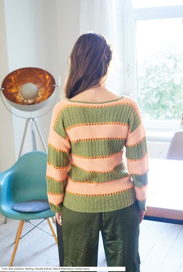 Ein frischer Farbmix aus breiteren grünen und orangefarbenen Streifen, abgegrenzt durch ein kleines Lochmuster in Apricot geben diesem Pulli mit kurzem Schlitz und rundem Halsausschnitt sein frisches Aussehen. Die Muster verlaufen mal horizontal, weil kraus rechts gestrickt, mal vertikal durch das Rippenmuster aus glatt rechten und kraus rechten Maschen. Der Schnitt ist einfach, mit geraden Armausschnitten. Reine, hautsympathische Baumwolle ist das Garn der Wahl, um den Pulli bis in den Sommer hinein zu tragen. Eine Anleitung gibt es für die Größen 36/38, 40/42 und 44/46.