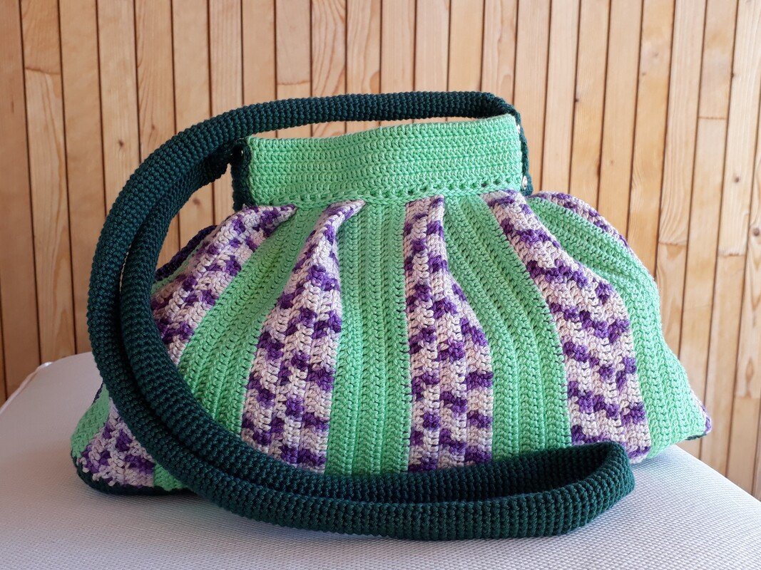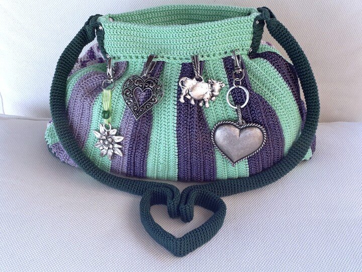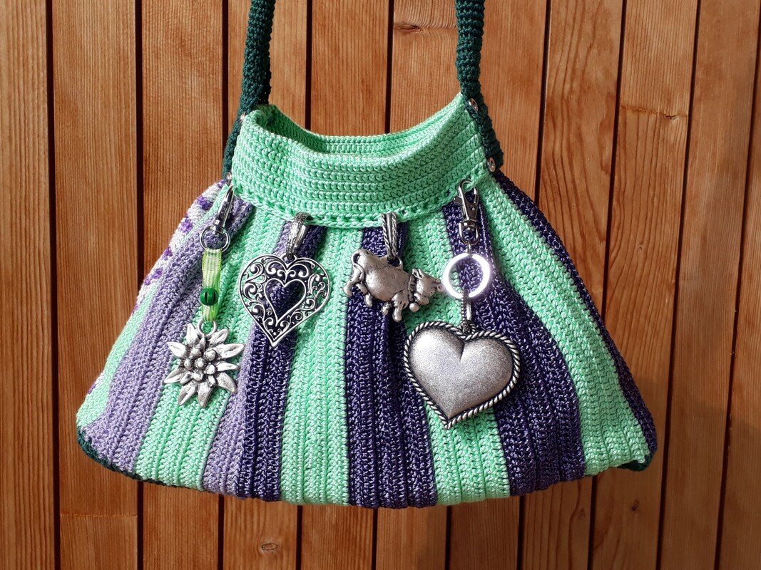 Meine kleine Tasche ist 27cm lang und oben 21cm breit. Hier habe ich Baumwolle mit einer Lauflänge von 125m je 50g (Häkelnadel 2,5mm) verwendet und 6 Knäuel gebraucht.