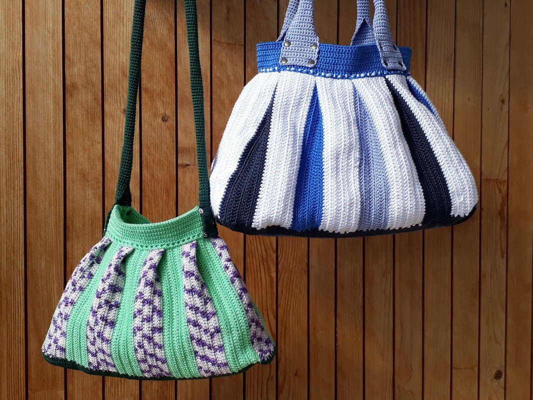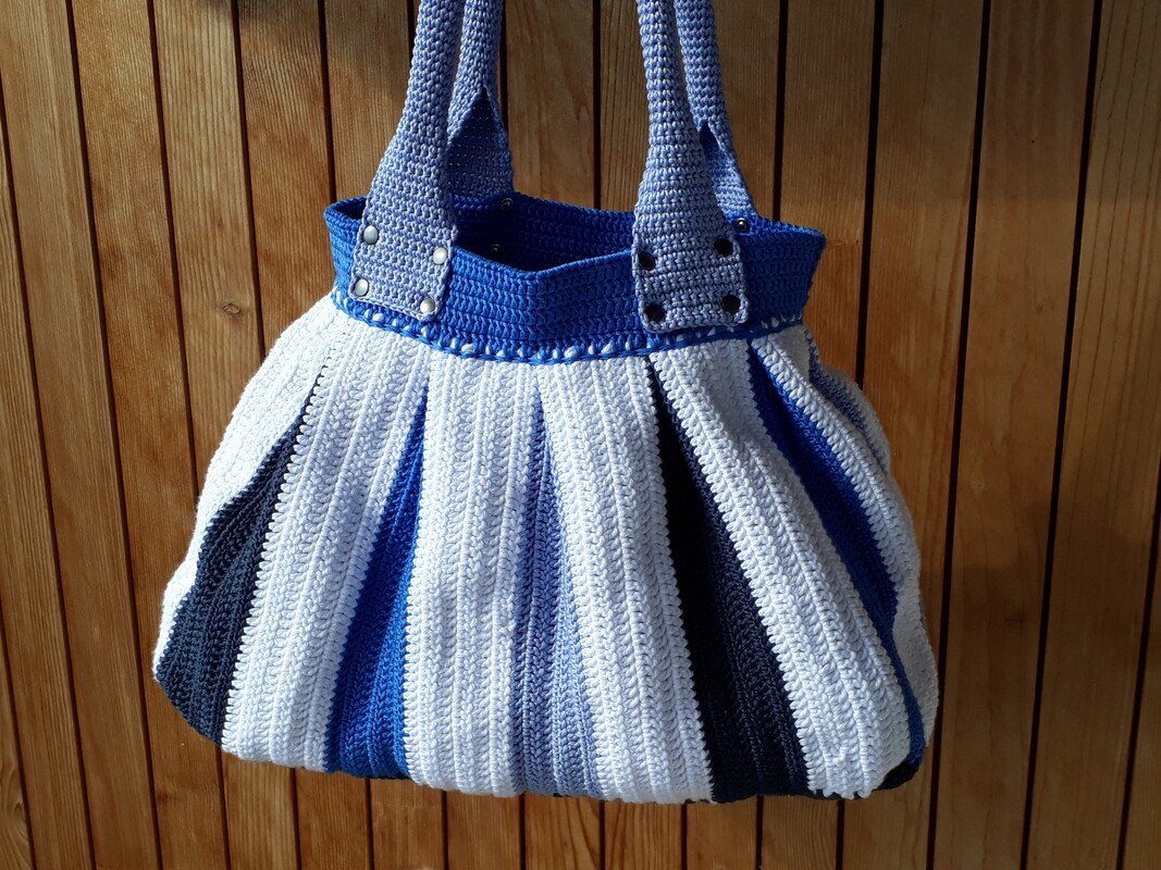 Meine große Tasche ist 35cm lang und oben 30cm breit. Ich habe Baumwolle mit einer Lauflänge von 100m je 50g (Häkelnadel 3mm) verwendet und 12 Knäuel gebraucht.