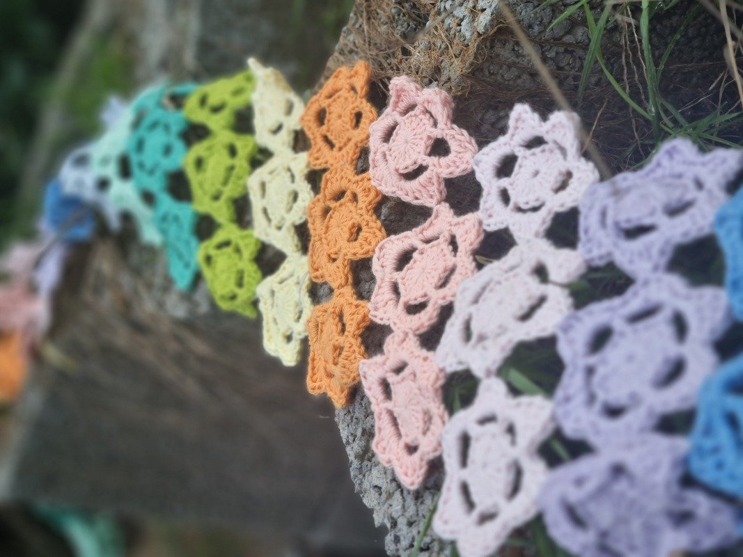 Baumwolle mit einer Lauflänge von 160m auf 50g (bei dünnerem oder dickerem Garn werden die Blümchen jeweils größer oder kleiner. Für die Stola brauchst du 10 Farben à ca. 25g)