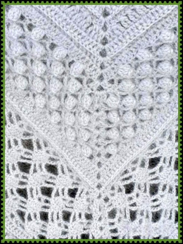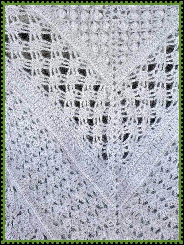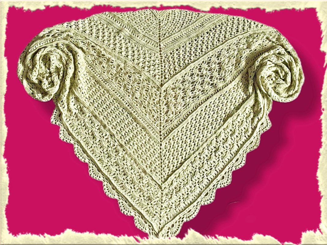 Häkelanleitung für ein großes, wunderschönes Dreieckstuch mit vielen interessanten Mustervarianten und einer Bordüre die das ganze Tuch abrundet.