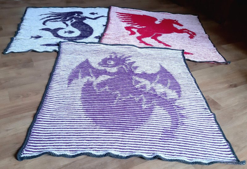 Meine Fabelwesen-Blöcke wurden ohne Rand 70 x 75cm groß und wiegen etwa 300g. Wenn man sie alleine lassen möchte, kann man noch etwa 100g für einen Häkelrand rechnen, z.B. mit einem Spitzenrand drumherum.