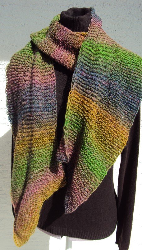 Gestrickt wird mit Garn in Sockenwollstärkte und Nadeln Nr. 5. Hier wurde eine Sockenwolle mit langem Fabverlauf verwendet, aber der Schal sieht bestimmt auch in einfarbig oder in anderen Mustern gut aus.
