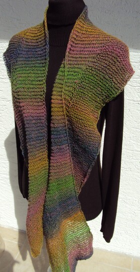 Dieser Schal wird in verkürzten Reihen gestrickt. Dadurch wird er in der einen Hälfte breiter und es entsteht eine Art Rüsche, die den Schal etwas interessanter macht.