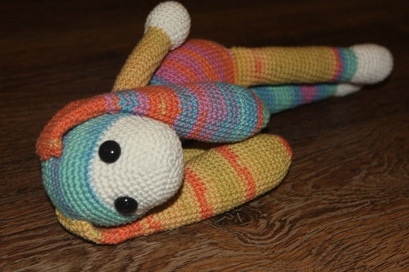 Das fertige Tierchen wird bei Verwendung von Schachenmayr Bravo und Nadelstärke 2,5 ca. 40 cm von Kopf bis Fuß.