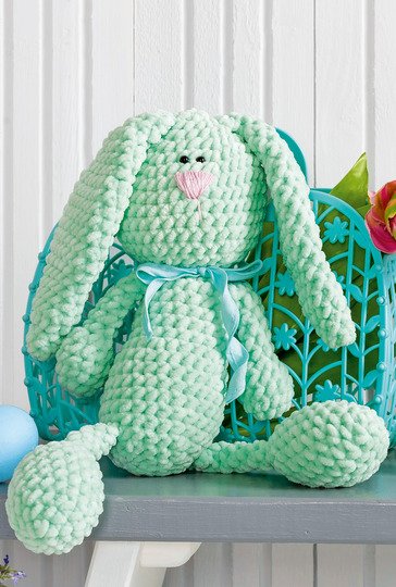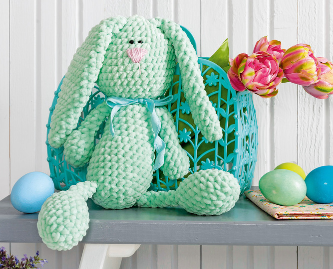 Dieser zuckersüße Schlenkerhase wird sicher gleich der beste Freund seiner kleinen Besitzer. Er ist 38 cm groß und wird mit dem mintgrünen Polyestergarn "Candy" von buttinette vor allem mit festen Maschen gehäkelt. Körper mit Kopf, Ohren, Füße mit Beinen sowie Hände mit Armen werden jeweils einzeln gehäkelt und später aneinandergenäht. Sein Schnäuzchen wird dem süßen Gesellen mit rosafarbenem Garn aufgestickt, für seine Augen werden zwei schwarze Perlen aufgenäht. Das Nacharbeiten ist dank der ausführlichen Anleitungen auch für etwas ungeübtere Häklerinnen kein Problem.