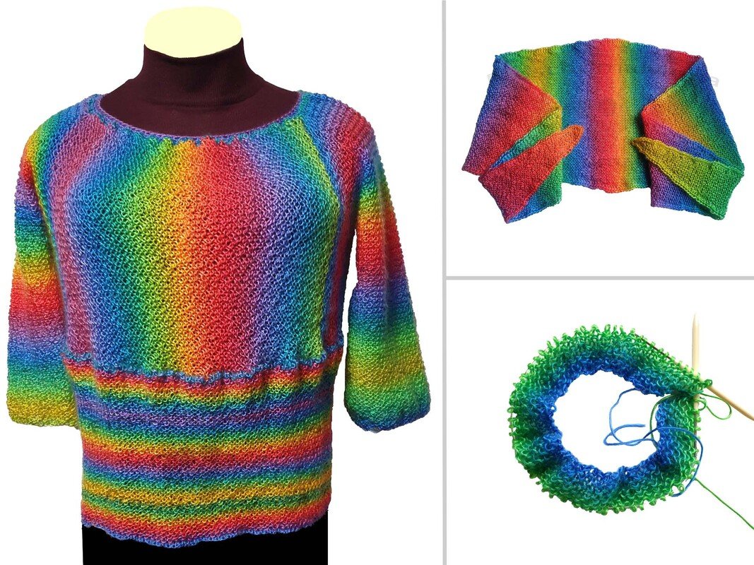 Der Schnitt des Pullovers und das Strickens in Hin- und Rückreihen alles rechts (kraus rechts gestrickt) machen beide Strickobjekte fernsehtauglich.