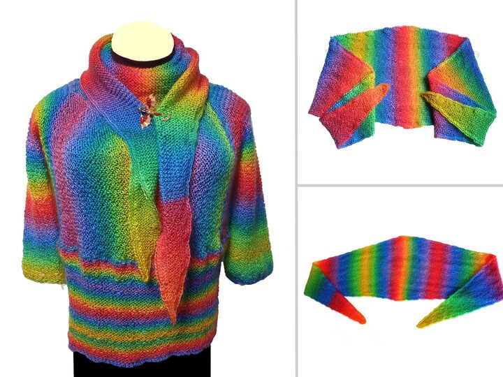 Das flache Tuch hat 2 Knäuel benötigt und ist nicht nur ein Accessoire in Verbindung mit dem Pullover. Es kann auch mit anderer Kleidung kombiniert werden.
