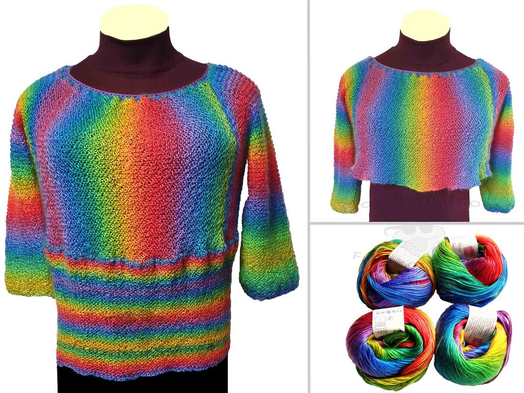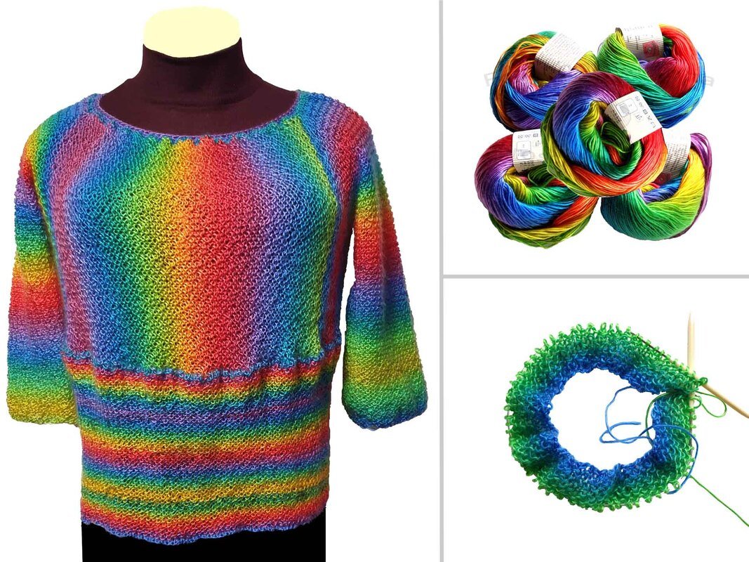 Ich habe für den Pullover gerade einmal 5 Regenbogen Knäuel mit a 50 g verwendet und das bei Kleidergröße 44/46 (wenn du es lockerer magst) bzw. 48/50 (wenn der Pulli enger anliegen soll)!