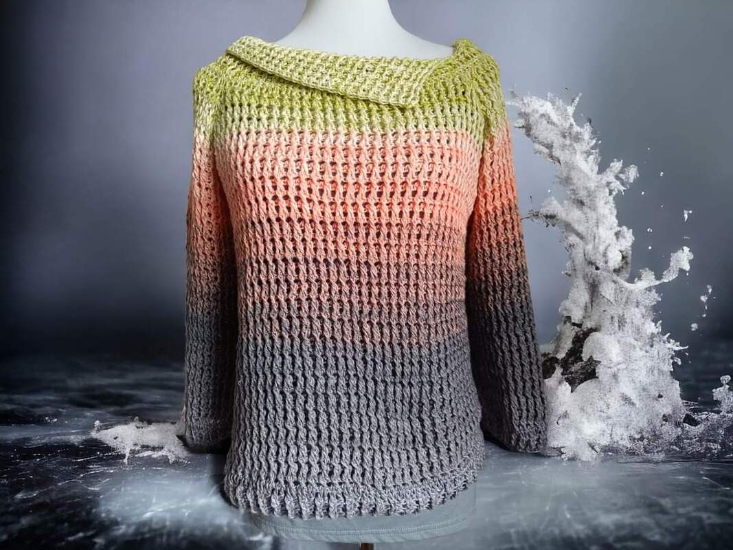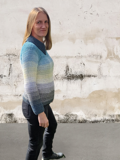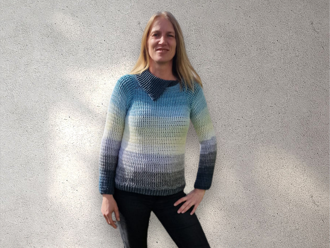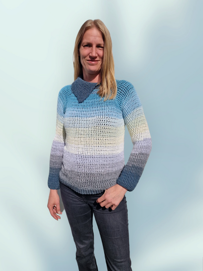 Der Pullover kann in jeder Kleidergröße gehäkelt werden.
