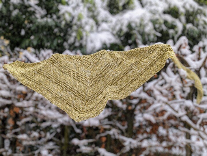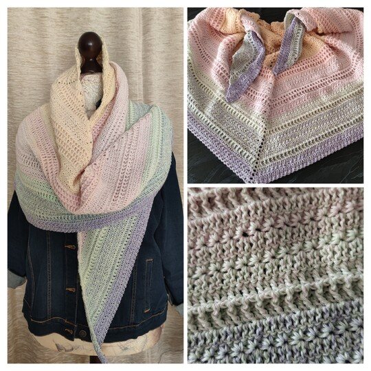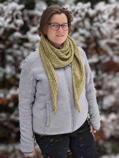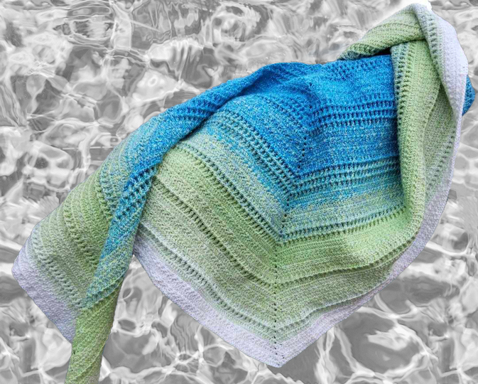Entdecke die Häkelanleitung für das vielseitige flache Dreieckstuch "Yve", perfekt für warme und kühle Tage!