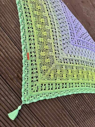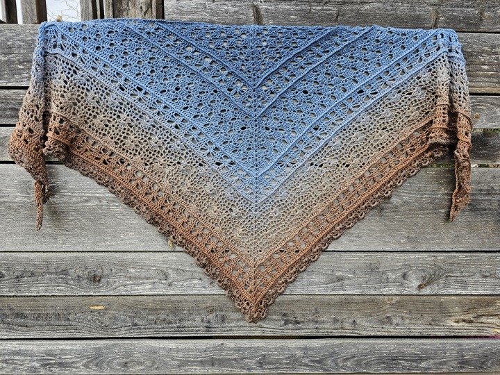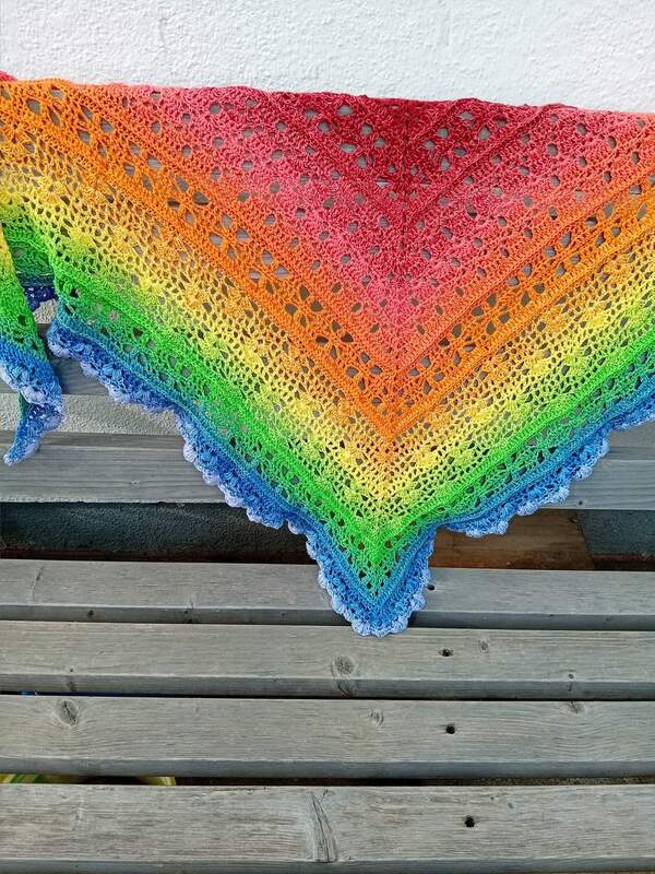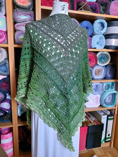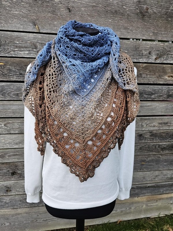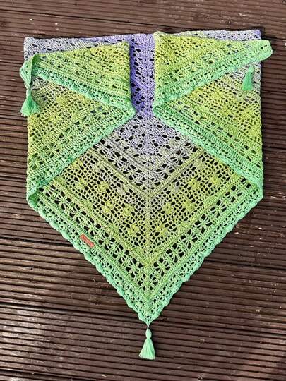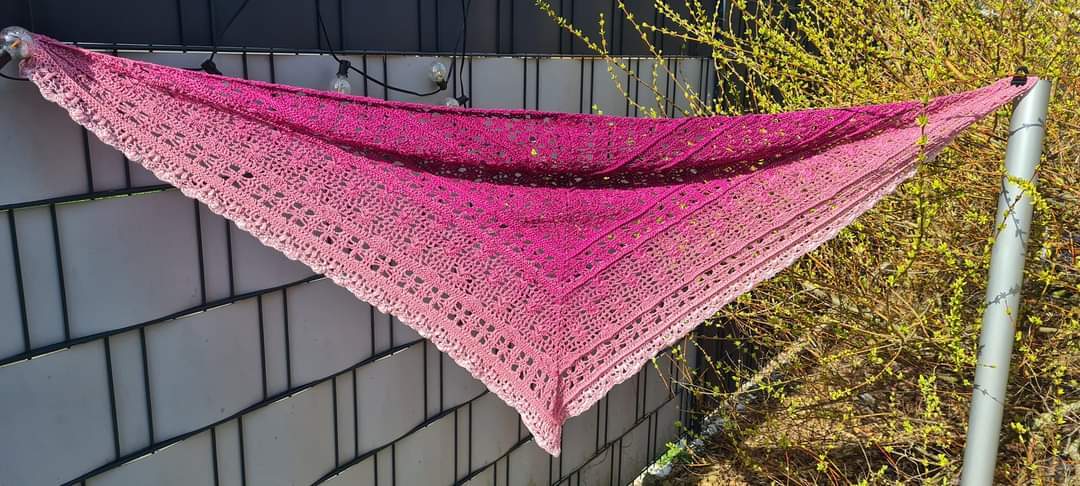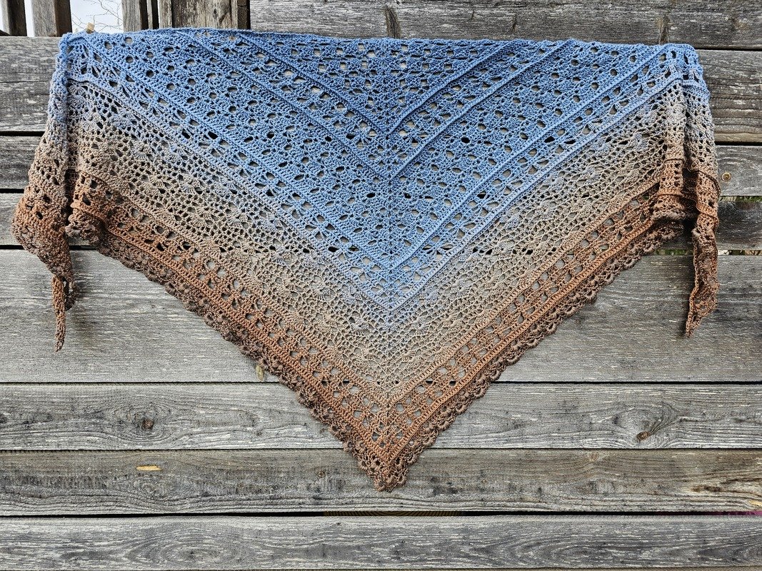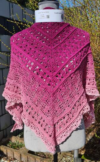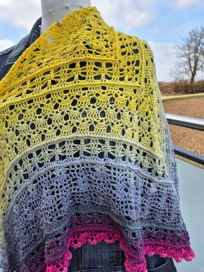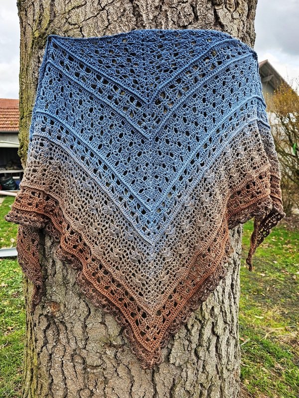 Es kann mit jedem gewünschten Garn gehäkelt werden, ich würde dazu einen Farbverlaufsbobbel mit 1000 m empfehlen. Ich habe für mein Tuch den Bobbel Bernie von Kandelas Handarbeitsbox verwendet.