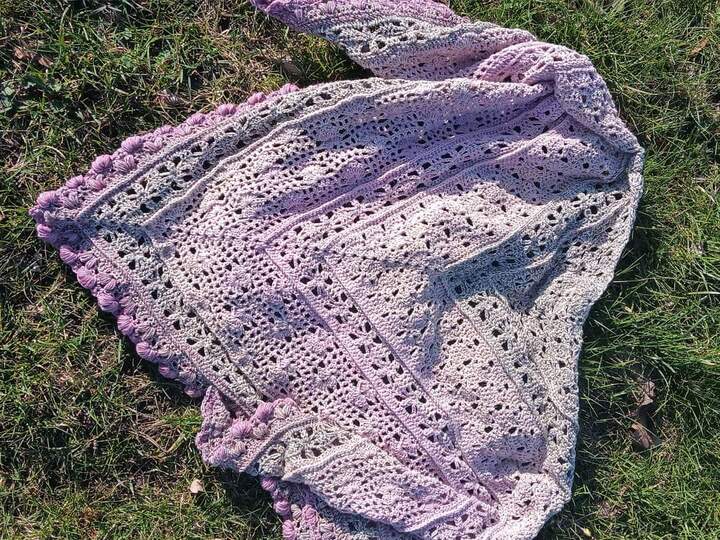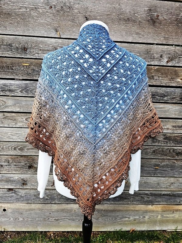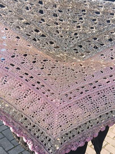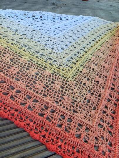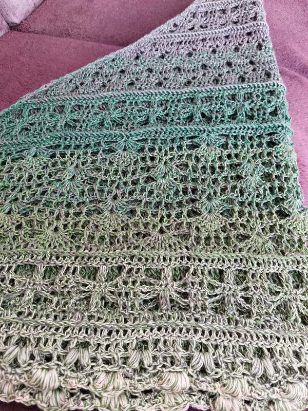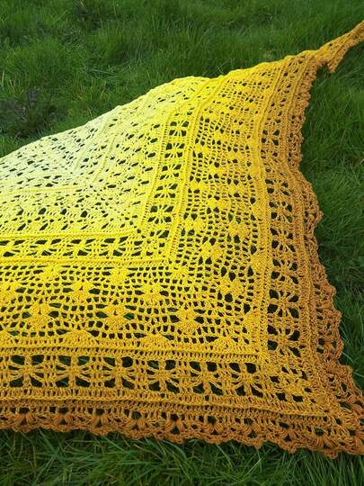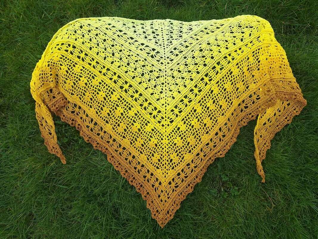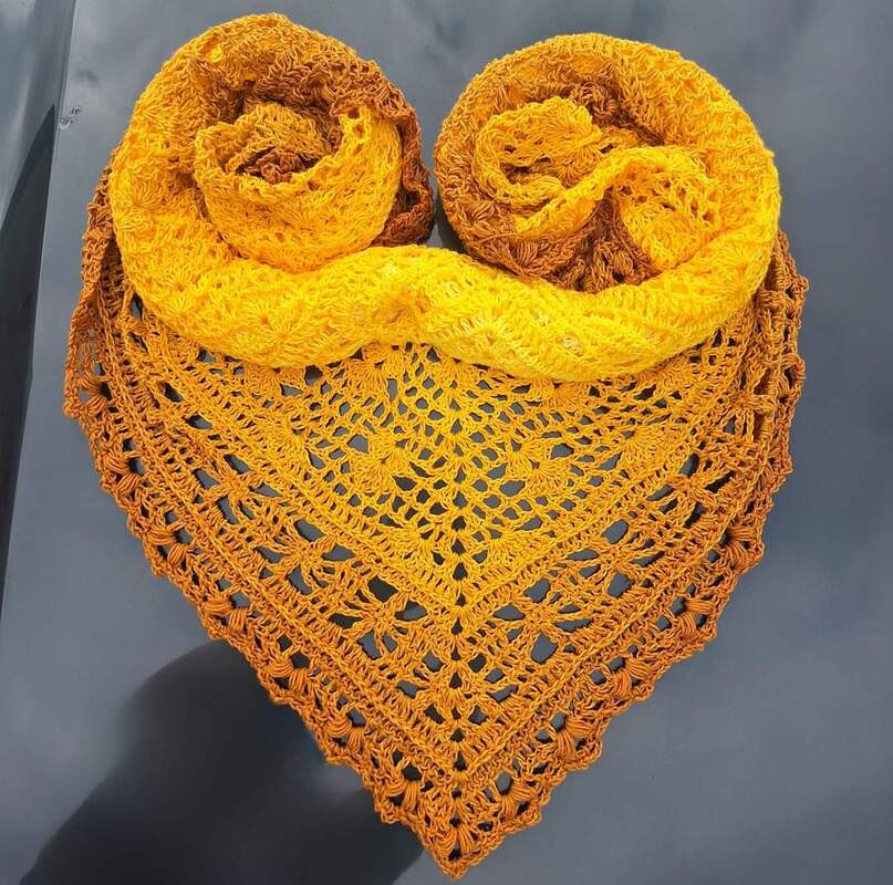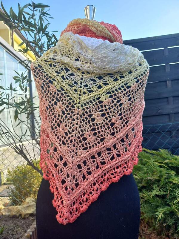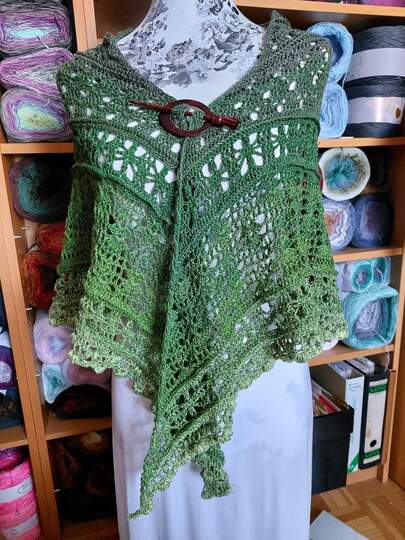 Es kann mit jedem gewünschten Garn gehäkelt werden, ich würde dazu einen Farbverlaufsbobbel mit 1000 m empfehlen. Ich habe für mein Tuch den Bobbel Bernie von Kandelas Handarbeitsbox verwendet.