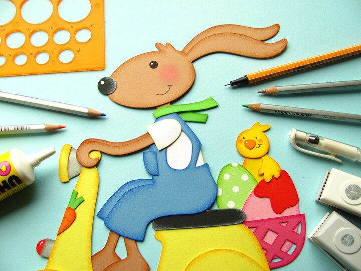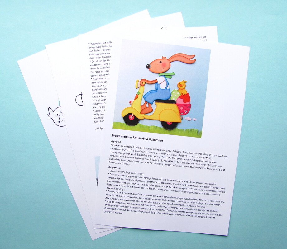 Der Osterhase ist mit seinem gelben Roller flott unterwegs, und Küken und Eier sind auch dabei. Für das lustige Fensterbild aus Fotokarton gibt es in diesem Download die Bastelvorlage sowie eine Grundanleitung in deutscher Sprache.
