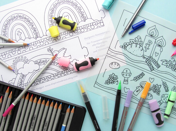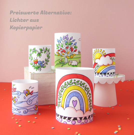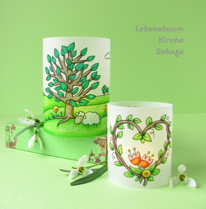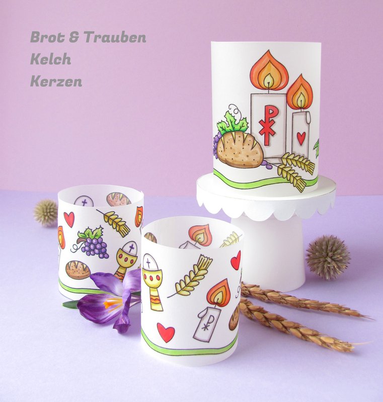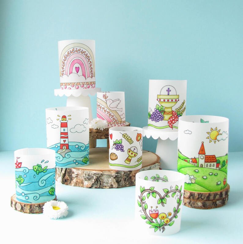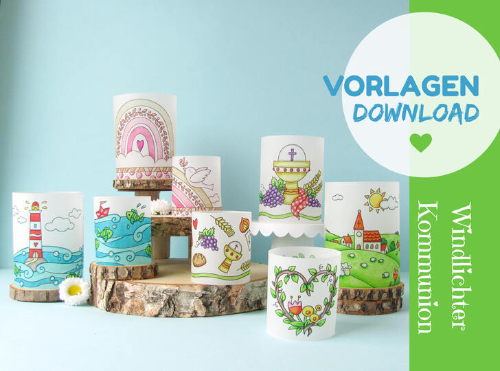 8 tolle, handgezeichnete Windlicht-Vorlagen als Download zum Ausdrucken und Ausmalen für alle weißen Feste wie Kommunion, Konfirmation, Firmung oder Jugendweihe. Es gibt die beliebten Themen Fische/Leuchtturm/Wal; Kelch/Hostie/Brot/Wein; Regenbogen/Taube und Lebensbaum/Kirche/Schafe. Die Lichter können ohne Klebstoff einfach zusammengesteckt werden.