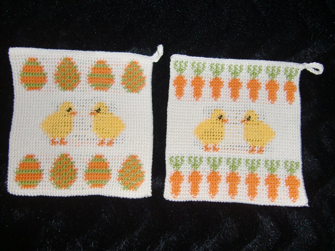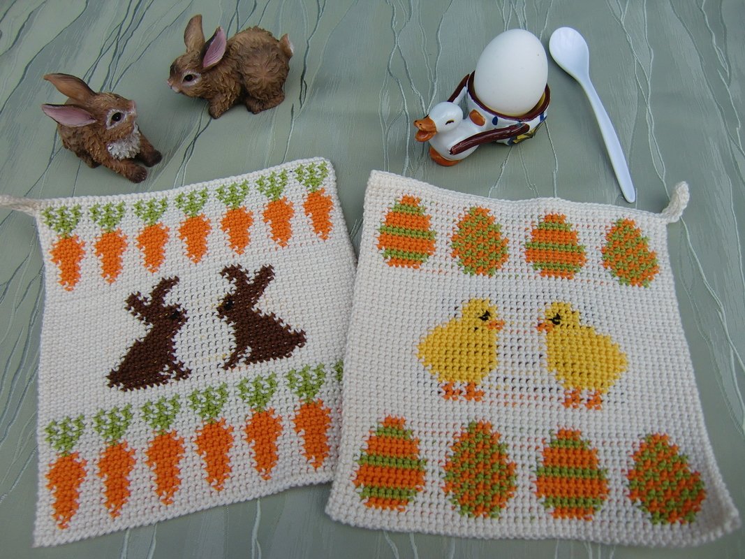 Wenn Ostern vor der Tür steht: Topflappen in Doubleface-Technik mit Küken- und Hasen-Motiven. Die 4 Motive dieser Topflappen sind beliebig miteinander kombinierbar..