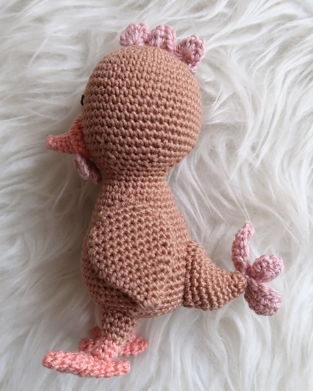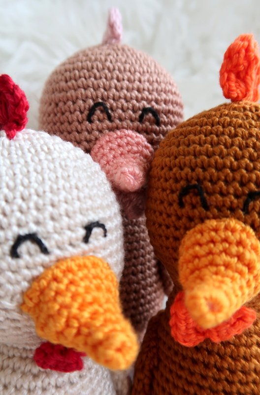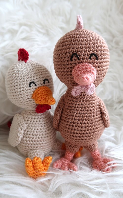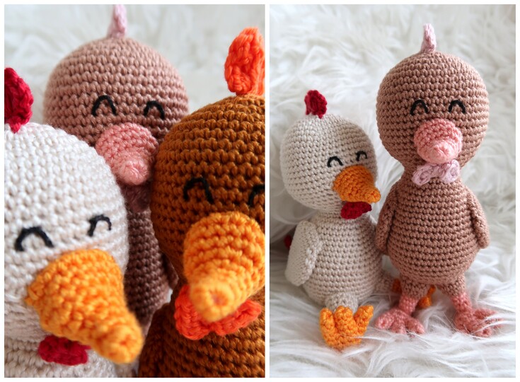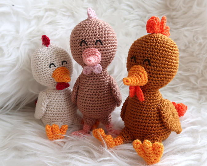 Wenn du mit Baumwolle (125m LL auf 50g) häkelst, misst dein Huhn ca. 14cm (sitzend) und 18cm (stehend) in der Höhe.