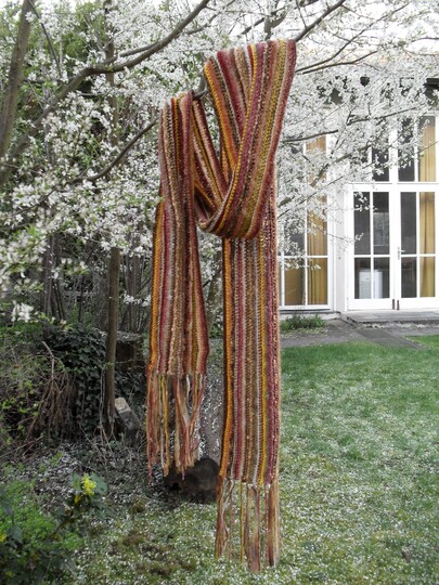 Was Sie brauchen sind etwa 400 Gramm Reste, je nach dem wie groß der Schal werden soll. Meine auf den Fotos sind ca. 2,20 Meter lang und 23 Zentimeter breit.