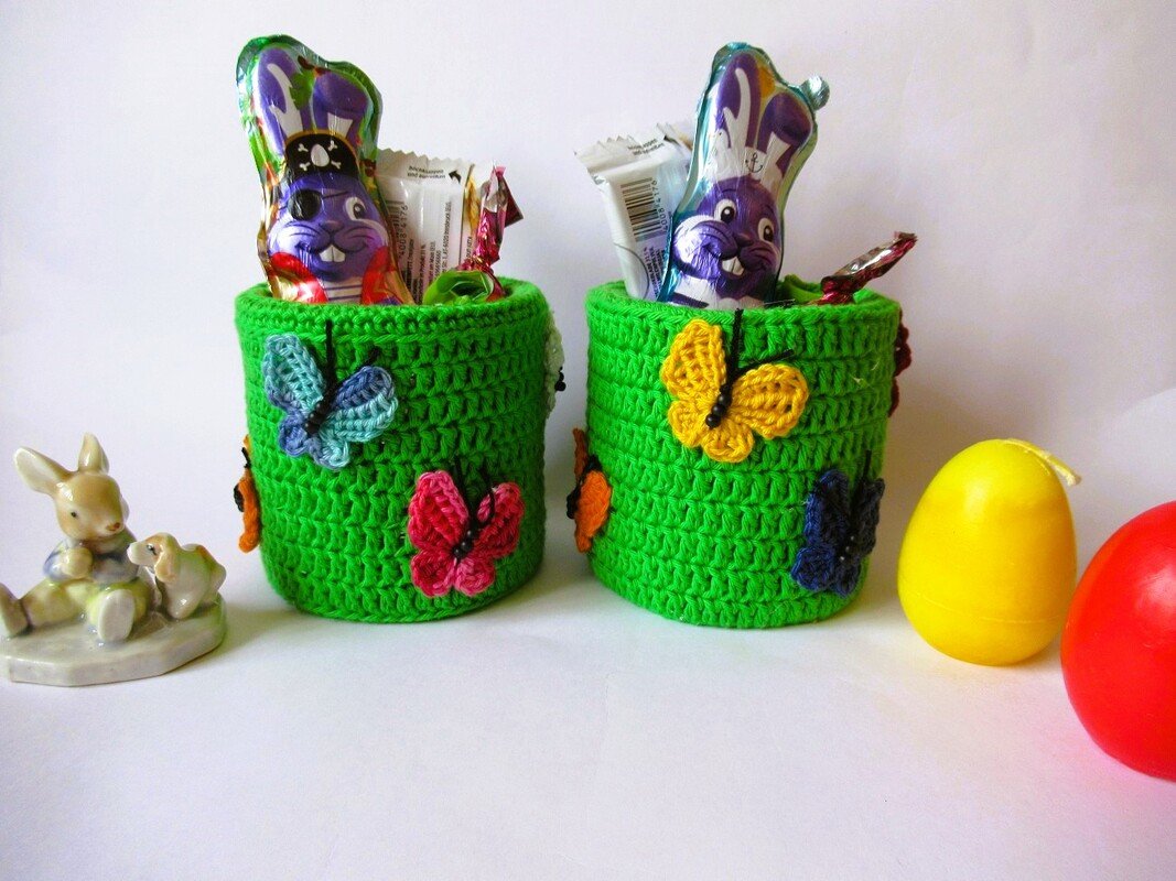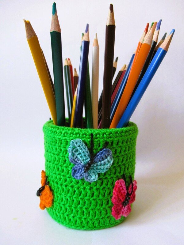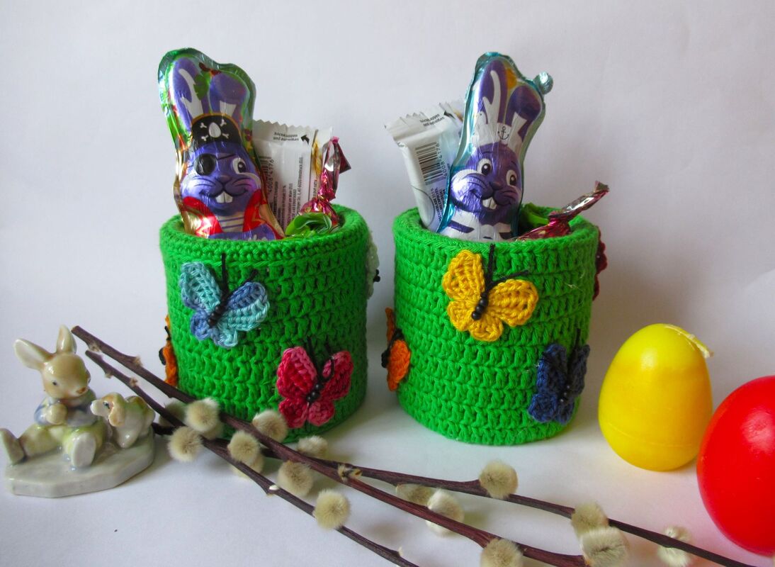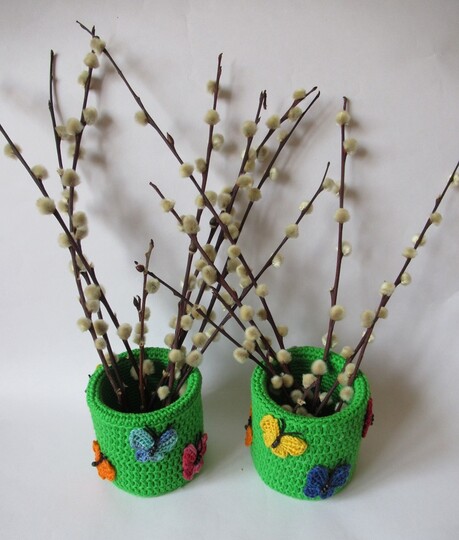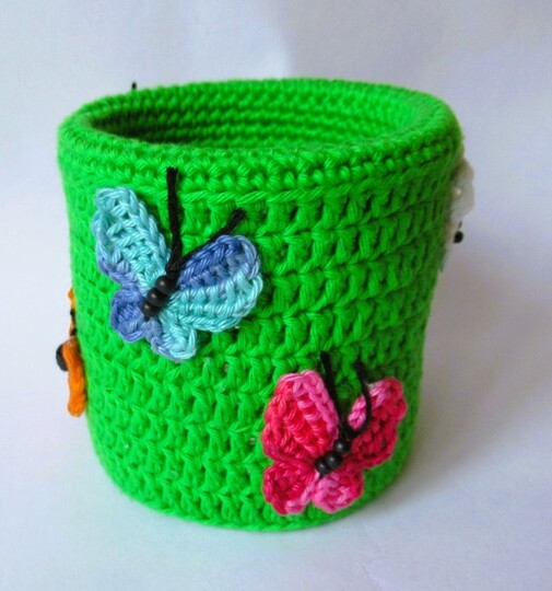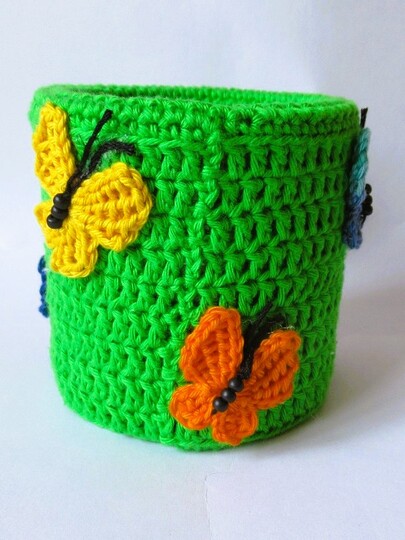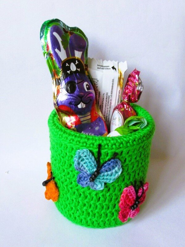 Eine hübsche, frühlinghafte Schmetterlingsdose für viele Verwendungen: als Osternest, geschenkeverpackung, als Stiftedose, zur Aufbewahrung von Häkelnadeln und vielem mehr. Dazu wird eine leere Konservendose umhäkelt und mit Schmetterlingen verziert. Ein ideales Projekt, um Wollreste aufzubrauchen.