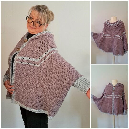 Die Poncho Jacke wird vorwiegend mit Stäbchen und Relief Stäbchen gehäkelt.