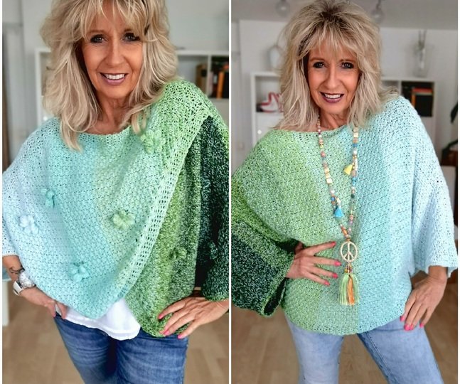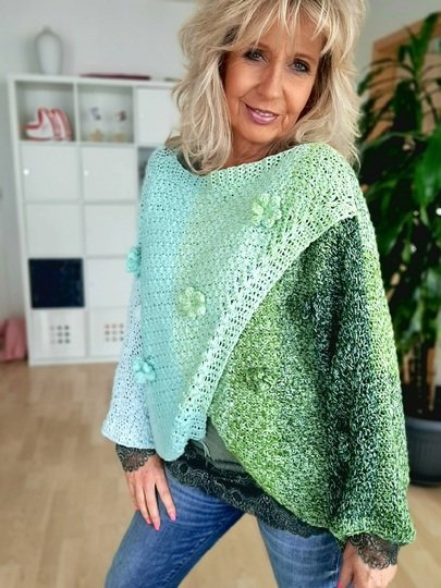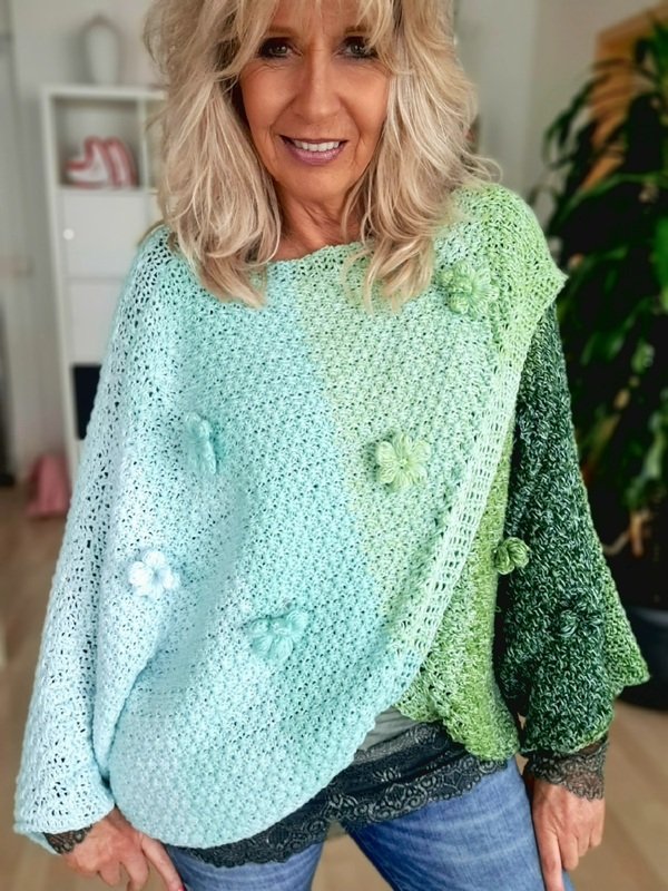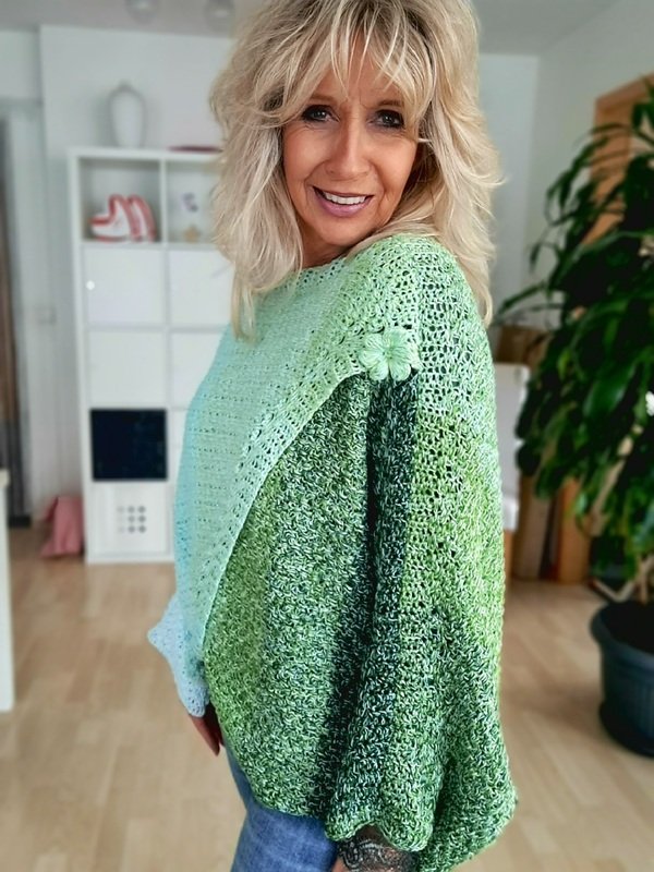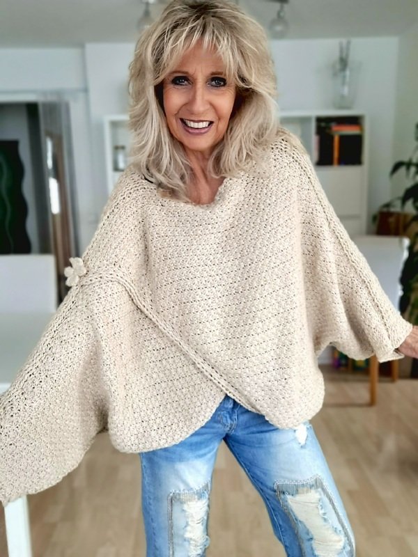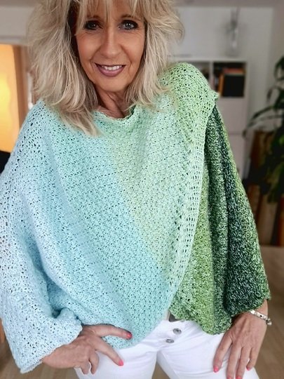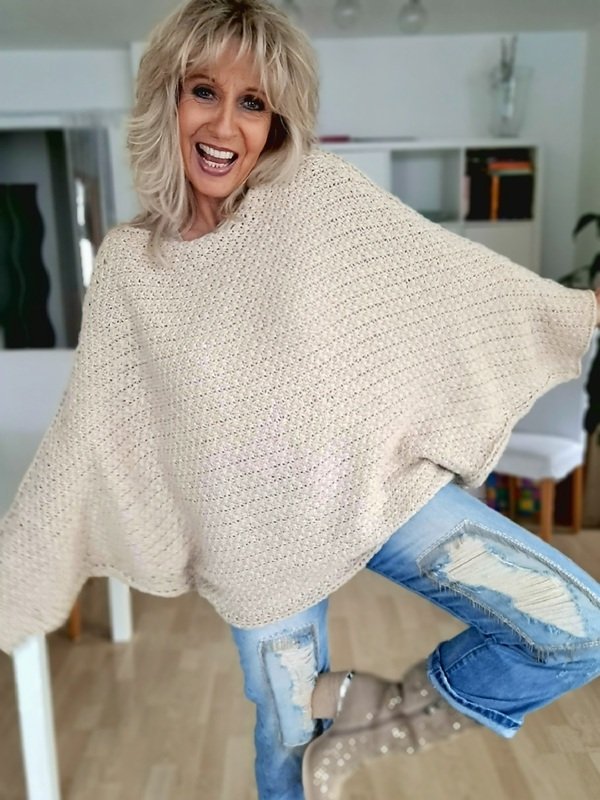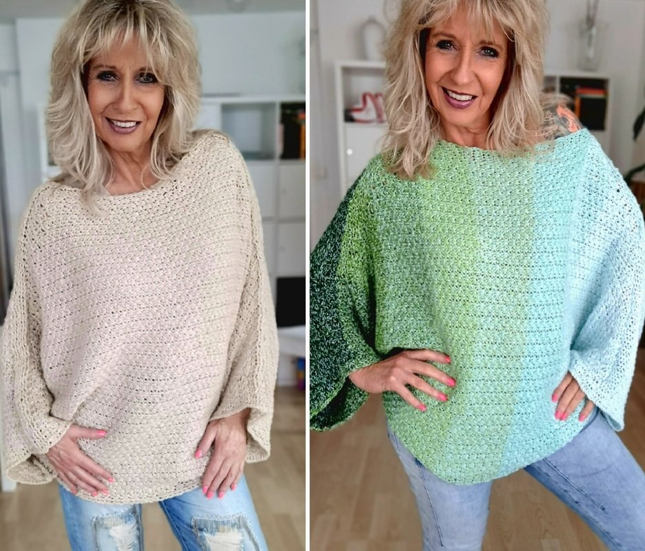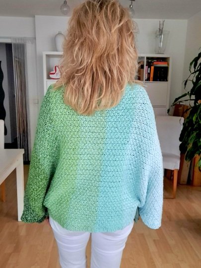 Als Pulli gehäkelt ist er in der klassischen Fledermaus-Form sehr bequem zu tragen und