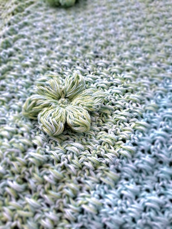 Die Blümchen werden separat gehäkelt und können mit Broschennadeln