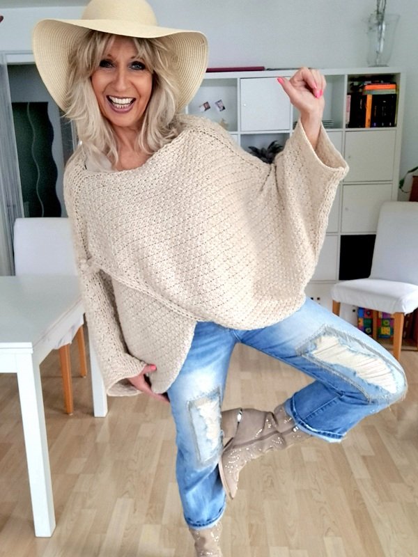 Creme beiger Poncholetti, hier im pullistyle: Hexenbobbel 70%Leinen 30%BW, 4fädig von „Hexengarn“
