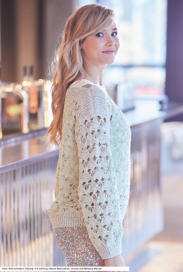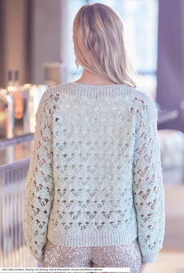 Bei diesem Pulli können auch AnfängerInnen problemlos mithalten – der einfache Schnitt und das nicht zu schwere Fallmaschenmuster machen es möglich. Er bezaubert mit seinem luftigen Fallmaschenmuster in Schmetterlingsoptik. Die Besonderheit des Modells: Das Rippenmuster an den Bündchen und im Bereich des Halsausschnitts wird zweifädig gestrickt (hier läuft ein silberfarbenes Häkelgarn aus Viskose und Polyester mit), was zusätzlich Struktur in den Pulli bringt, sodass das hauptsächliche Muster ganz filigran wirkt – es wird mit hellgrünem Baumwolle-Polyester-Mischgarn gestrickt. Eine Anleitung gibts für die Größen 36/38, 44/46 und 50/52.