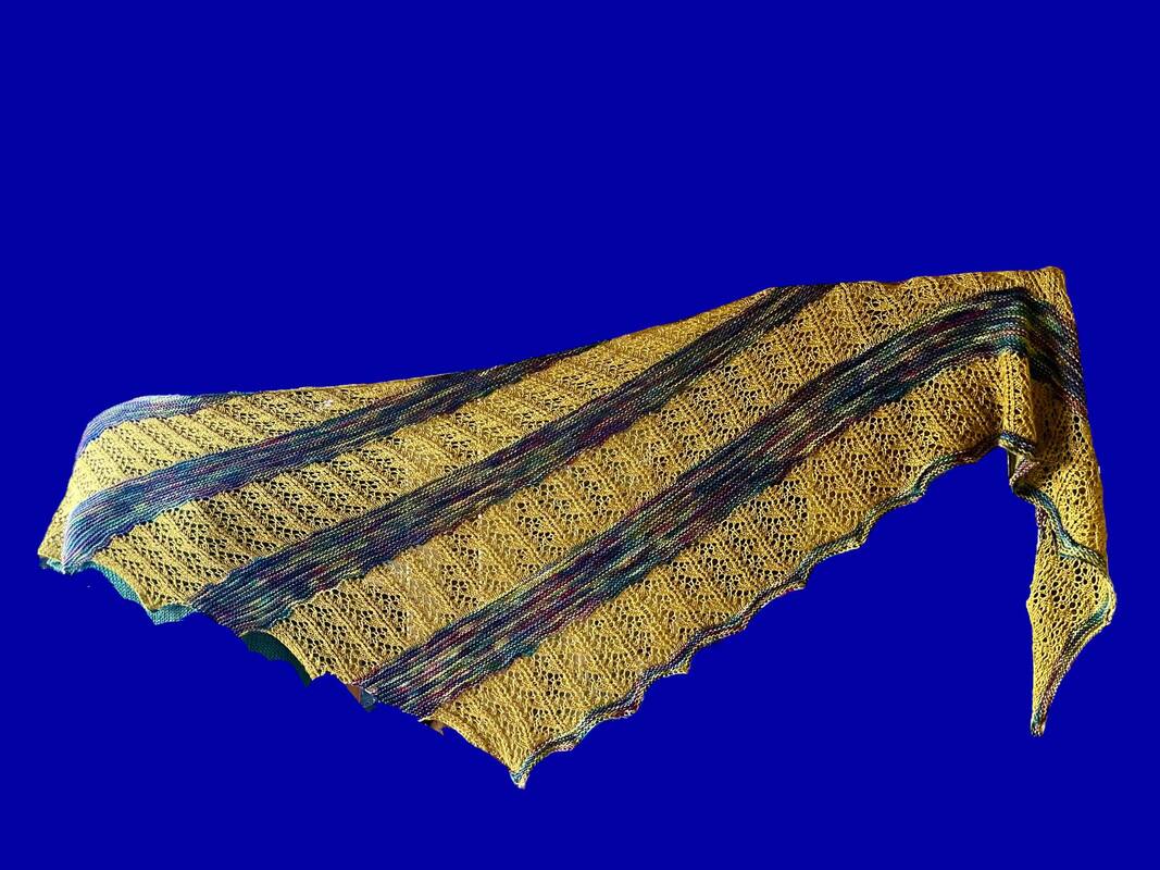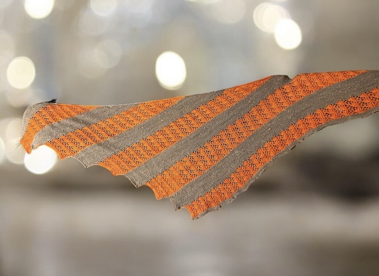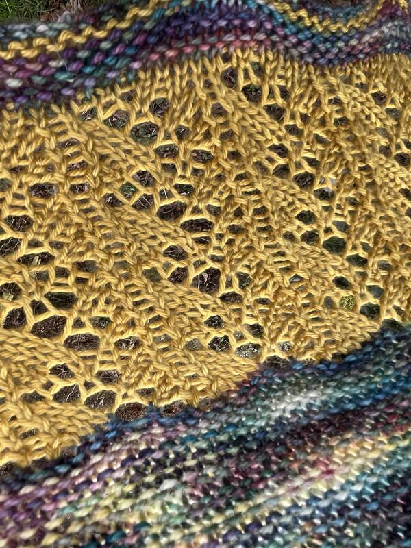 Mit der unifarbenenen Wolle wird ein einfaches Lochmuster gestrickt und mit der melierten Wolle werden kraus rechts gestrickte Streifen gestrickt.