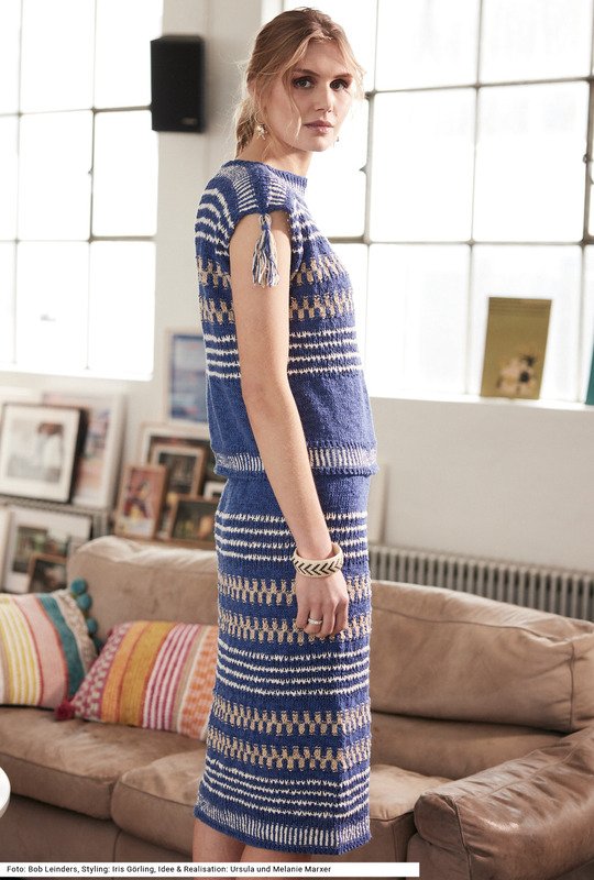 Dieses bequeme Duo bestehend aus ärmellosem Top und schmalem Rock können sowohl als Set, aber natürlich auch solo getragen werden. Die Quasten an den Schulternähten des Oberteils und an einer Schlitzseite zaubern entspanntes Hippie-Flair in den Look. Die Musterstreifen sind in ihrer Folge unterschiedlich angeordnet: mal ein Rippenmuster, mal Hebemaschen, mal Jacquard. Überwiegend in Blau, setzen sich die beigen und weißen Muster schön voneinander ab. Alle Teile sind einfache Rechtecke. Der Rock bleibt unten an den Seiten offen, sodass man bequemen gehen kann. Zum Sommer passt das Baumwolle-Leinen-Mischgarn perfekt. Eine Anleitung gibt es für die Größen 36/38, 40/42 und 44/46.
