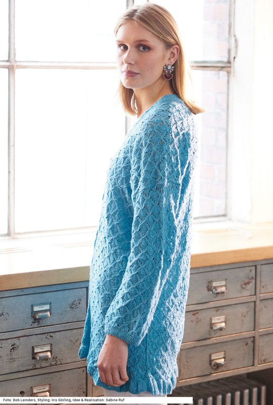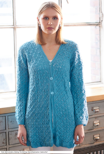 Diese Jacke aus einem weichen Baumwoll-Polyamid-Mischgarn umschmeichelt die Figur. Die weiten, ganz geraden Ärmel und der ebenso gerade weite Schnitt lassen es zu, auch mal einen dünnen Pulli darunter zu tragen. Interessant ist der Saum: Er wird zwar einfach im Rippenmuster gestrickt, dieses bekommt seinen volantartigen Schwung dadurch, dass das Ajour-Rautenmuster das Gestrick etwas enger zusammenzieht. Die Vorderteilblenden werden im Hebemaschenmuster gleich mitgestrickt. Knöpfe gibt es nur im Brustbereich. Die Anleitung hierfür gibt es in den Größen 40/42, 46/48 und 52/54.