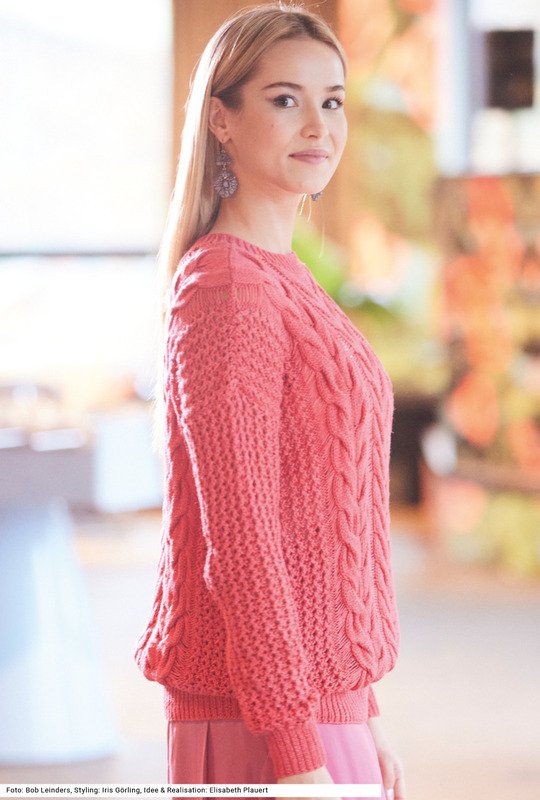 Bei diesem Pulli aus einem roten Viskose-Baumwolle-Leinenmischgarn (das super über die Nadeln läuft) kommt nie Langeweile beim Stricken auf. Interessant sind nicht nur die breiten Zöpfe mit Lochmuster in der Mitte und die daneben verlaufenden Tulpenzöpfe, es sind auch die Fallmaschenstreifen dazwischen. Die gerade eingesetzten Ärmel sind im selben Netzmuster gearbeitet wie die Seiten von Vorder- und Rückenteil. Alle Bündchen und die Halsausschnittblende sind im 1/1-Rippenmuster gestrickt. Eine Anleitung hierfür steht in den Größen 38/40, und 42/44 sowie 48/50 zur Verfügung.
