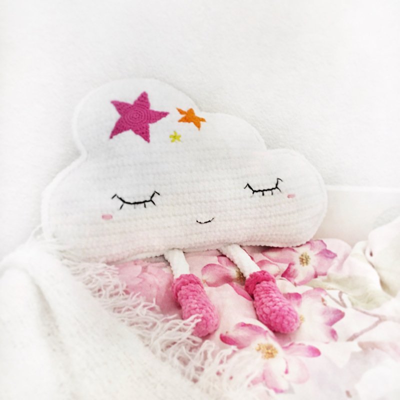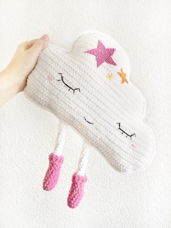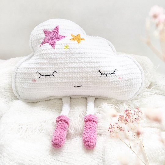 Die süße Wolke Wilma mit ihren Baumelbeinen ist schnell und einfach gehäkelt. Gestalte beide Seiten individuell und du erhälst ein Wendekissen.