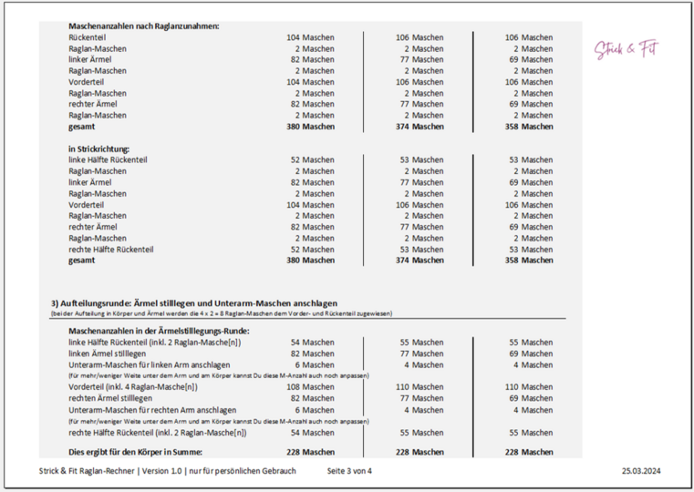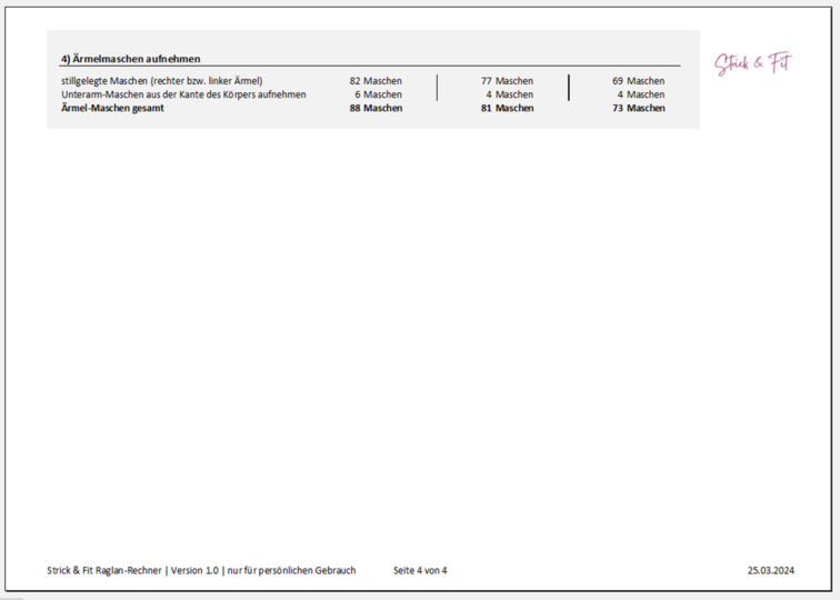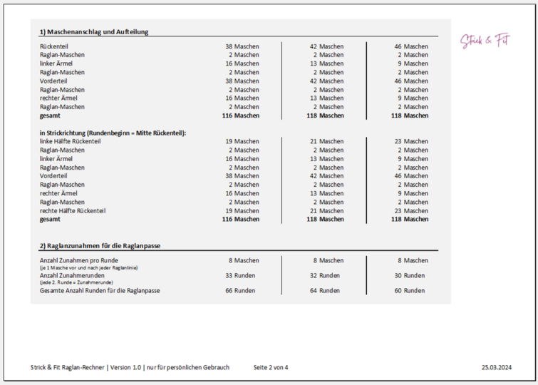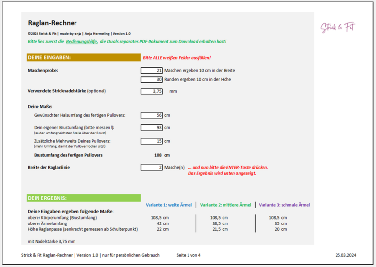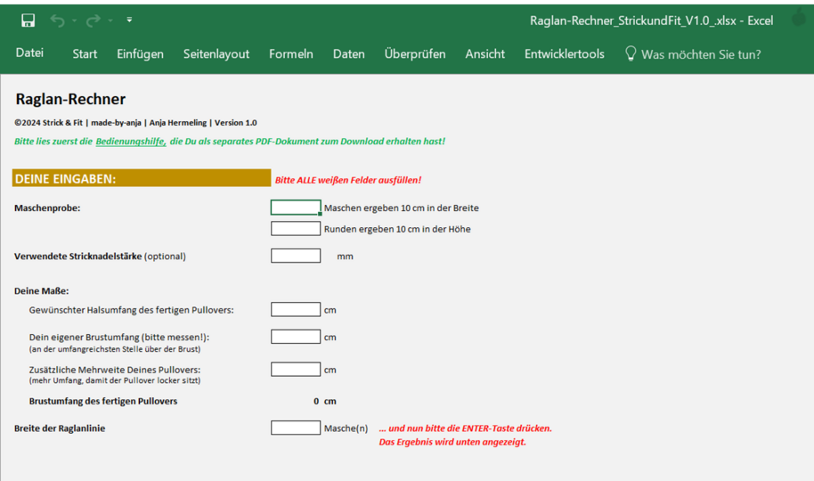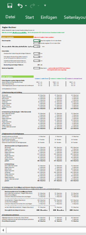 Der Strick & Fit Raglan-Rechner (EXCEL-Tabelle) ist kinderleicht zu bedienen und liefert Dir sofort alle Informationen, die Du benötigst. Die Ergebnisse sind übersichtlich aufbereitet, so dass Du direkt anfangen kannst zu stricken.