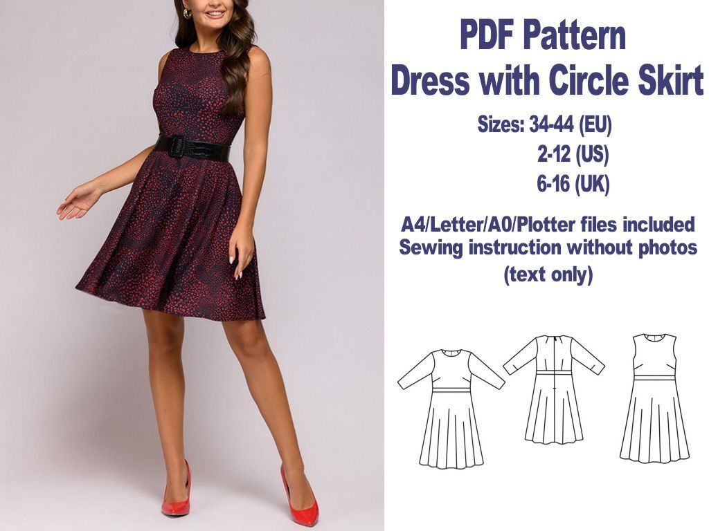 Dress with bust darts, circle skirt, in-seam pockets, invisible back zipper, 2 sleeve length options (without sleeves or 3/4 length).