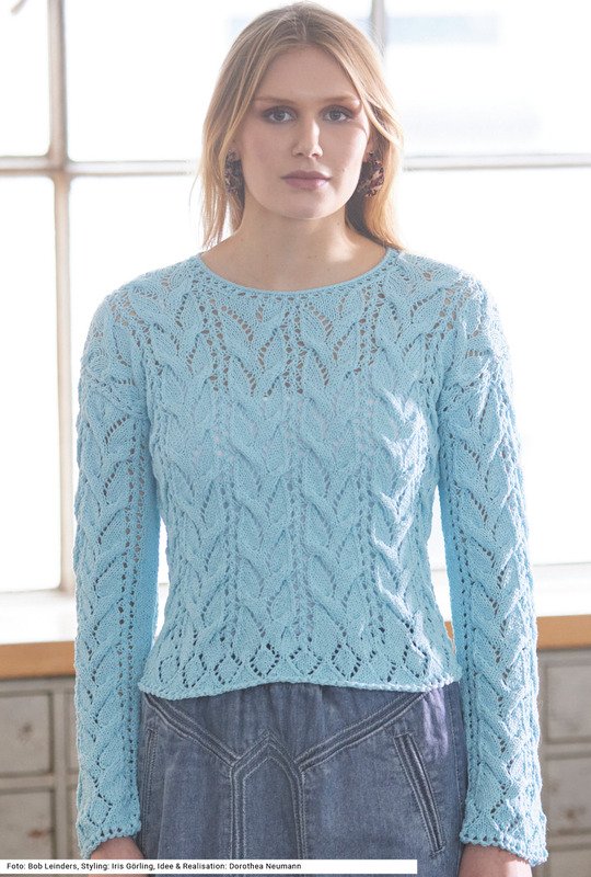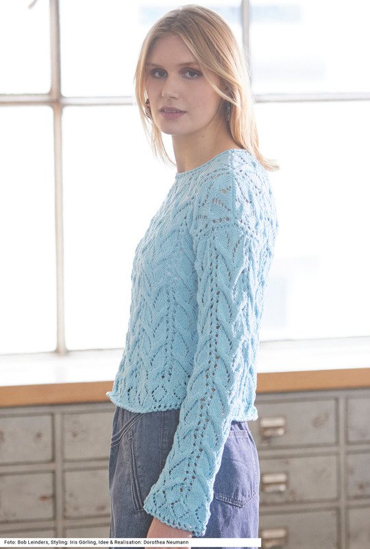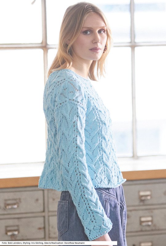 Dieser kurze, weite Pulli mit gerade eingesetzten Ärmeln wird aus einem weichen mintfarbenen Viskose-Baumwolle-Polyester-Garn gearbeitet. Nach dem doppelten Kreuzanschlag gibt es zunächst einen schmalen Lochmusterstreifen, danach einen Streifen aus Ajourrauten, gefolgt vom flächigen Zopf-Ajourmuster. Sowohl das Rauten- als auch das Ajour-Zopfmuster sind nicht kompliziert zu stricken. Eine Besonderheit ist die Ausschnittblende: Hier gibt es wieder den Lochmusterstreifen, dann wird mit einem I-Cord, der in der Anleitung erklärt ist, abgekettet. Die Anleitung hierfür ist für die Größen 36/38, 44/46 und 50/52 vorhanden.