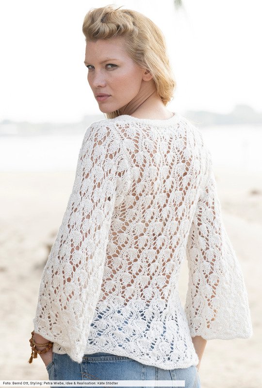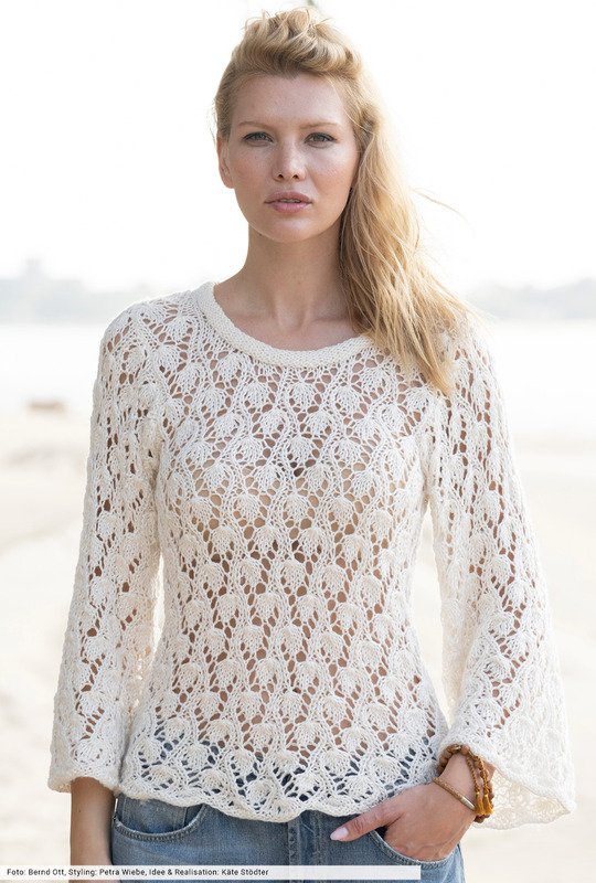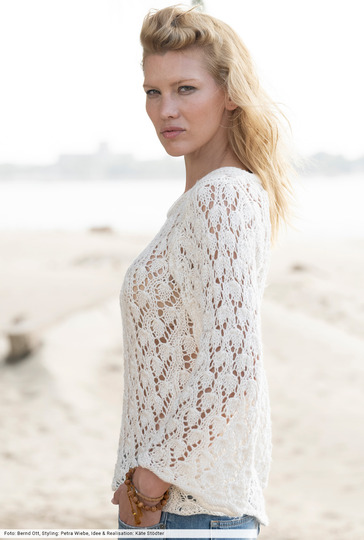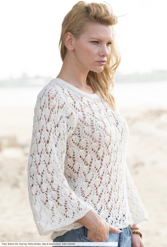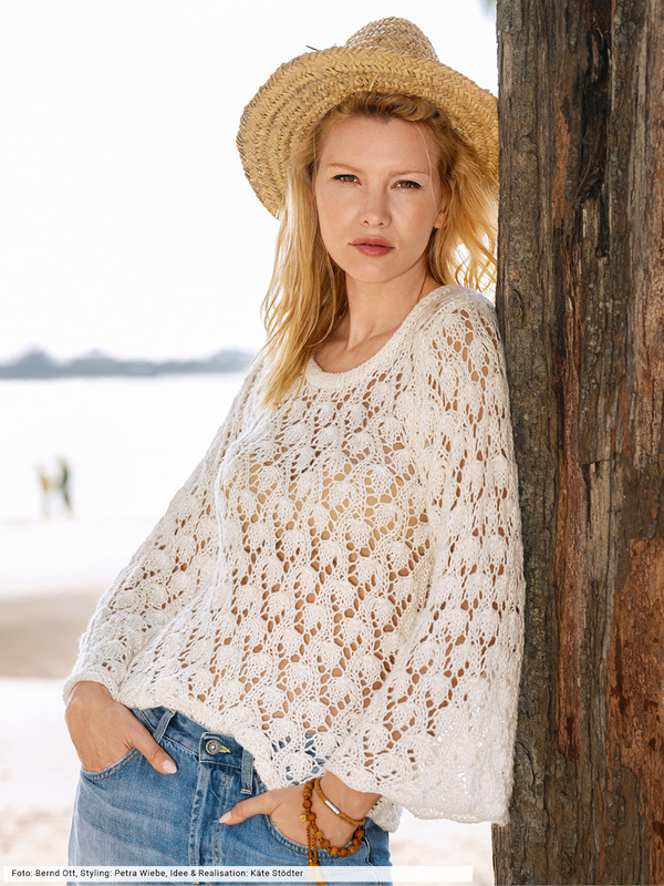 Filigrane Ajourstrukturen sind die perfekte Grundlage für sommerlich-leichte Strickmodelle. Bei diesem weißen Pulli aus kühlendem Leinenmischgarn wird das Muster mit Hilfe unserer Strickschrift allover gestrickt und mit Glatt-Links-Blenden umrahmt. Auch die schmale Halsblende wird glatt links gearbeitet, jedoch in Runden. Wenn du alle vier Teile zusammengenäht hast, erhälst du ein kombifreundliches Teil, das sich wirklich jedem Modestil bestens anpasst und dich über den ganzen Sommer begleiten wird.