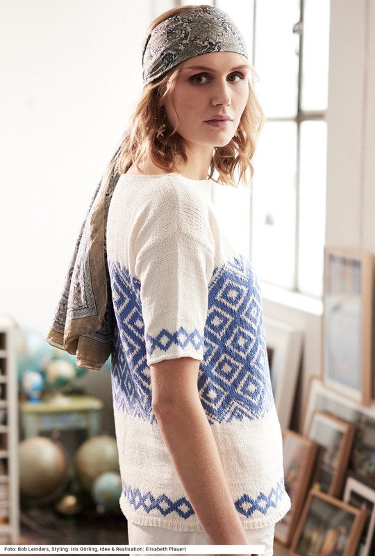 Dieser Kurzarmpulli in strahlendem Blau und Weiß erinnert mit seinem Rauten-Jacquardmuster an griechische Keramikfliesen. Ein kleines Rautenmuster zu Beginn von Vorder- und Rückenteil sowie an den Ärmeln lockert die an sich strenge Musterung auf dem weißen, glatt rechts gestrickten Grund auf. Um den niedrigen runden Halsausschnitt wird am Schluss lediglich noch eine Runde linker Maschen gestrickt, für einen sauberen Abschluss. Nur der 1 cm breite Bund ist im Rippenmuster gearbeitet. Es wird mit einem Baumwollgarn mit wenig Polyester-Beimischung gearbeitet. Die Anleitung kann für die Größen 36/38, 42/44 und 48/50 downgeloadet werden.