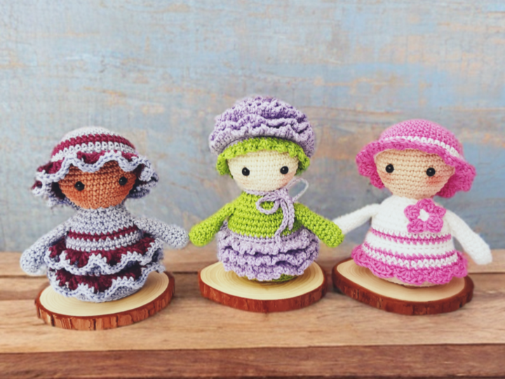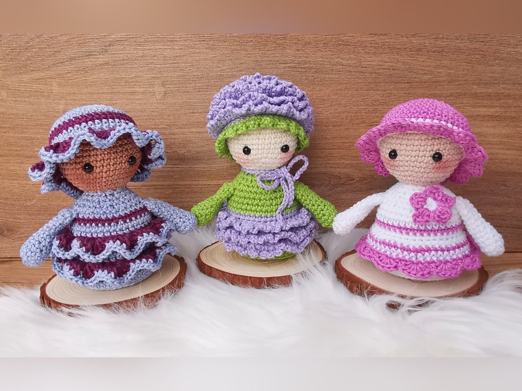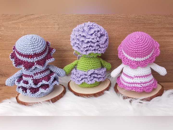 Diese niedlichen Blumenmädchen sind recht flott und einfach gehäkelt. Sie machen sich ganz prima als Dekoration auf eurer Fensterbank und ihr habt immer schnell mal ein tolles Geschenk für einen lieben Menschen parat. Für einen perfekten Stand empfehle ich, die Püppchen auf kleine Holzscheiben zu kleben. Das sieht dann auch gleich besonders schön aus.
