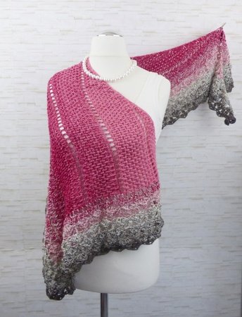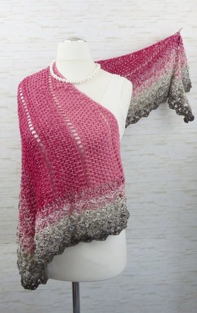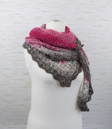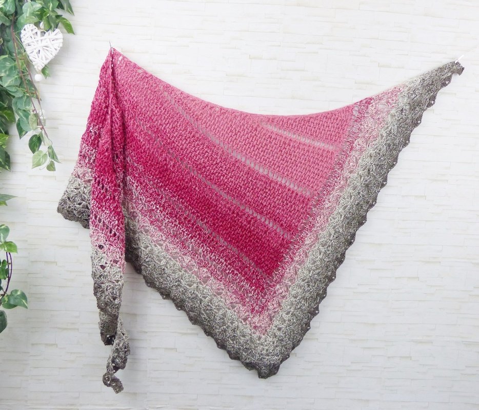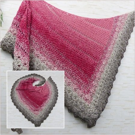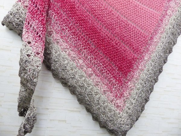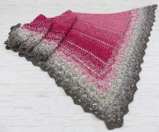 "DrachenTreedy" ist ein gehäkelter Drachenschwanz in Form eines Dreieckstuches. Er hat ein schönes Rippmuster, kombiniert mit einem Muschelmuster, das einen schönen Zackenabschluss ergibt. Er ist schnell gehäkelt, da sich das Muster immer wieder abwechselt.