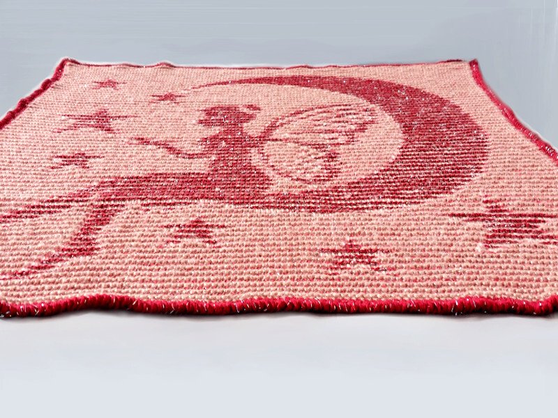 Meine Fabelwesen-Blöcke wurden ohne Rand 70 x 75cm groß und wiegen etwa 300g. Wenn man sie alleine lassen möchte, kann man noch etwa 100g für einen Häkelrand rechnen, z.B. mit einem Spitzenrand drumherum.