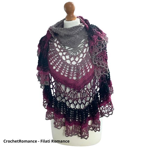 Der Schal hat eine Dreiecksform und misst circa 160cm x 70cm. Die Größe kann je nach verwendetem Garn abweichen.