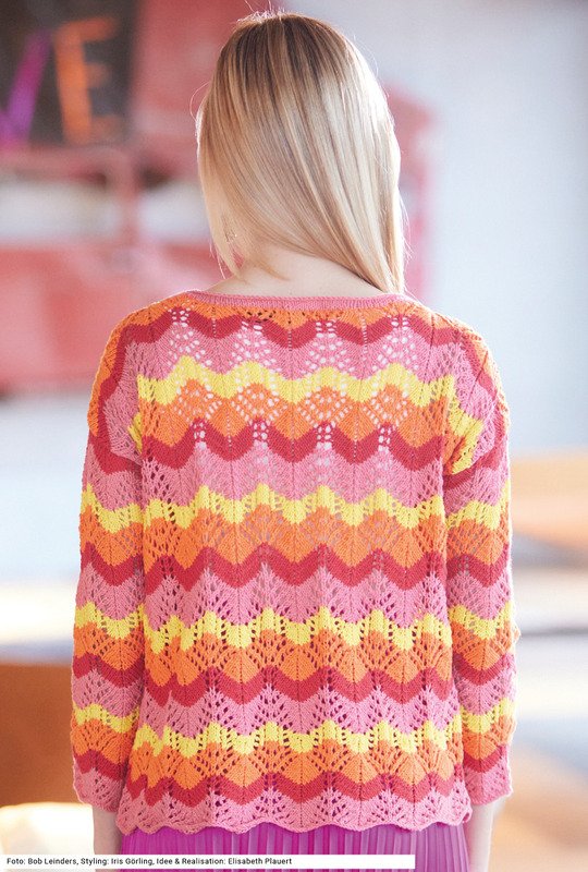 Azalee, Dunkelrot, Orange und Sonnengelb strahlen bei diesem Pulli um die Wette. Konzentration ist gefragt beim Stricken des zarten Ajourmusters, bei dem die sanften Wellen von allein entstehen und durch den Farbwechsel betont werden. Das hauptsächlich aus Baumwolle bestehende Garn lässt sich wunderbar verstricken. Alle Teile sind ganz gerade gearbeitet, wobei die Ärmel im oberen Bereich an Weite zunehmen. Der runde Halsausschnitt hat nur wenig Tiefe und bekommt eine Rollrand. Eine Ableitung kann für die Größen 36/38, 42/44 und 48/50 downgeloadet werden.