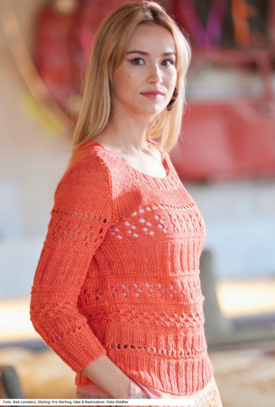 Für StrickerInnen, denen nur ein Muster zu stricken zu langweilig ist, kommt dieser gerade geschnittene Pulli aus einem korallefarbenen Viskose-Baumwolle-Leinen-Gemisch gerade recht. Mit dem abwechslungsreichen Mix aus glatt rechts, Rippen-, Stern- und Ajourmusterstreifen sowie verkreuzten Maschen ist der Strickspaß garantiert. Nicht kompliziert, aber dennoch vielfältig. Bündchen und Halsausschnittblende werden im 2/2-Rippenmuster gearbeitet. Der Schnitt ist klassisch, die 7/8-langen Ärmel haben eine hohe Armkugel, sodass die Schulterpartie perfekt passt. Eine Anleitung steht für die Größen 36/38, 40/42 und 44/46 zur Verfügung.